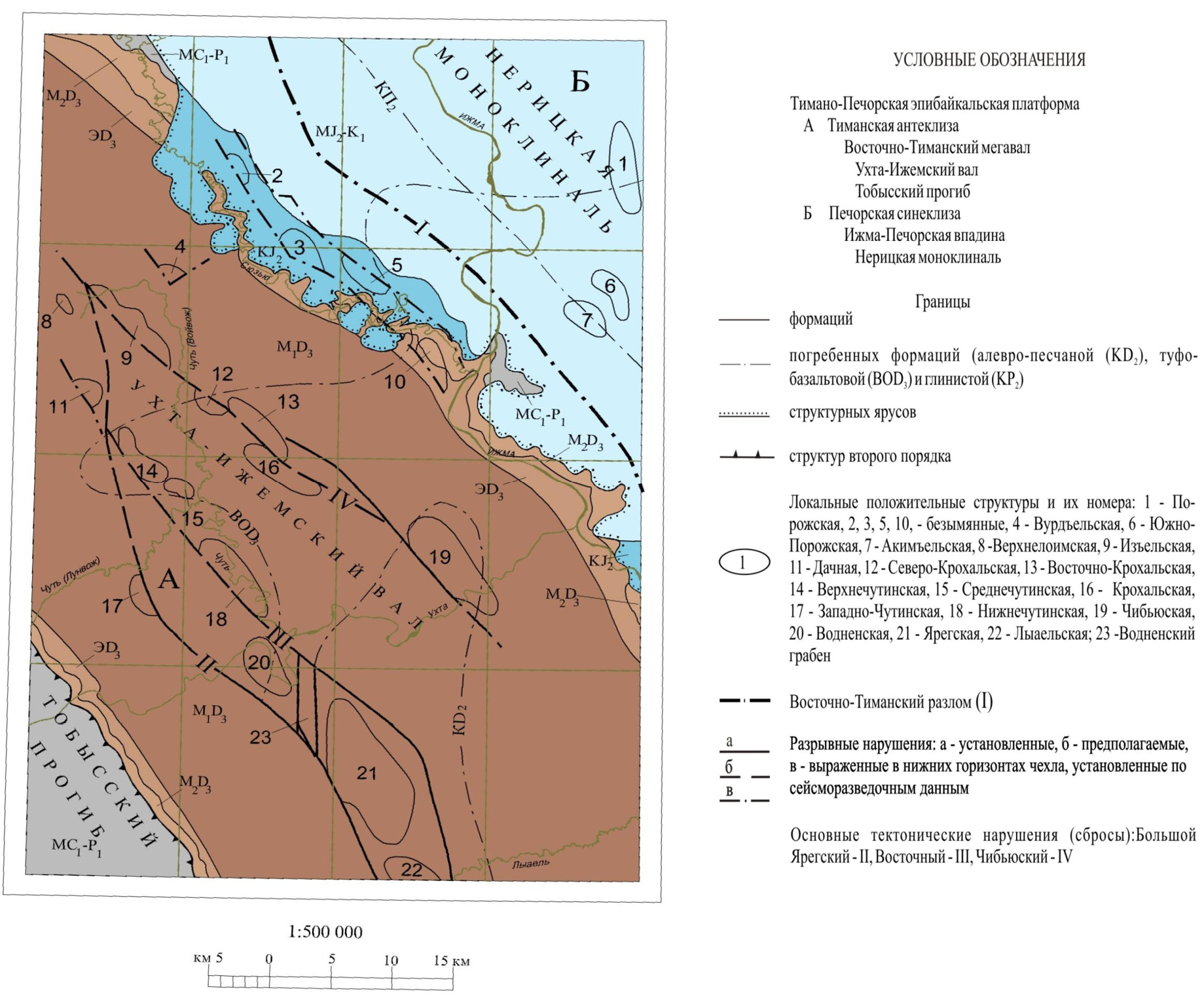 Территория исследования охватывает фрагменты двух крупнейших структур: юго-восточную часть Восточно-Тиманского мегавала Тиманской гряды и юго-западный борт Ижма-Печорской впадины Печорской синеклизы, являющихся главными (надпорядковыми) структурами Тимано-Печорской эпибайкальской платформы (рис. 1). Граница между Печорской синеклизой и Тиманской грядой проходит по региональному Восточно-Тиманскому разлому [13].