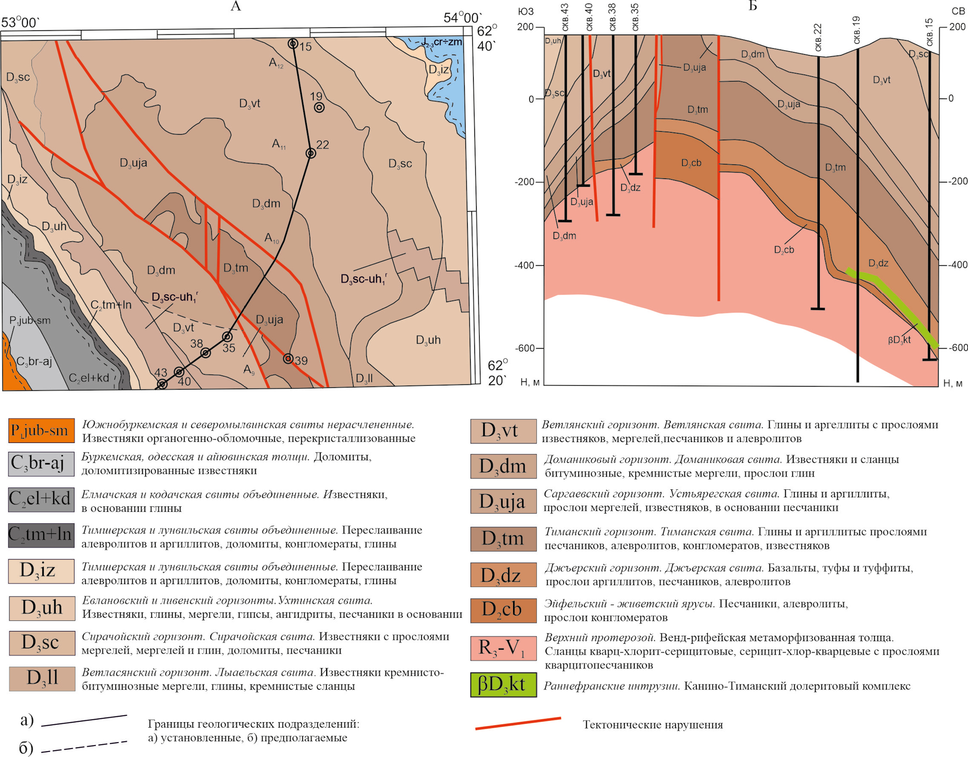 Рисунок 2. А – фрагмент геологической карты Ухтинской складки Тиманской гряды; Б – геологический разрез по линии скважин [13].