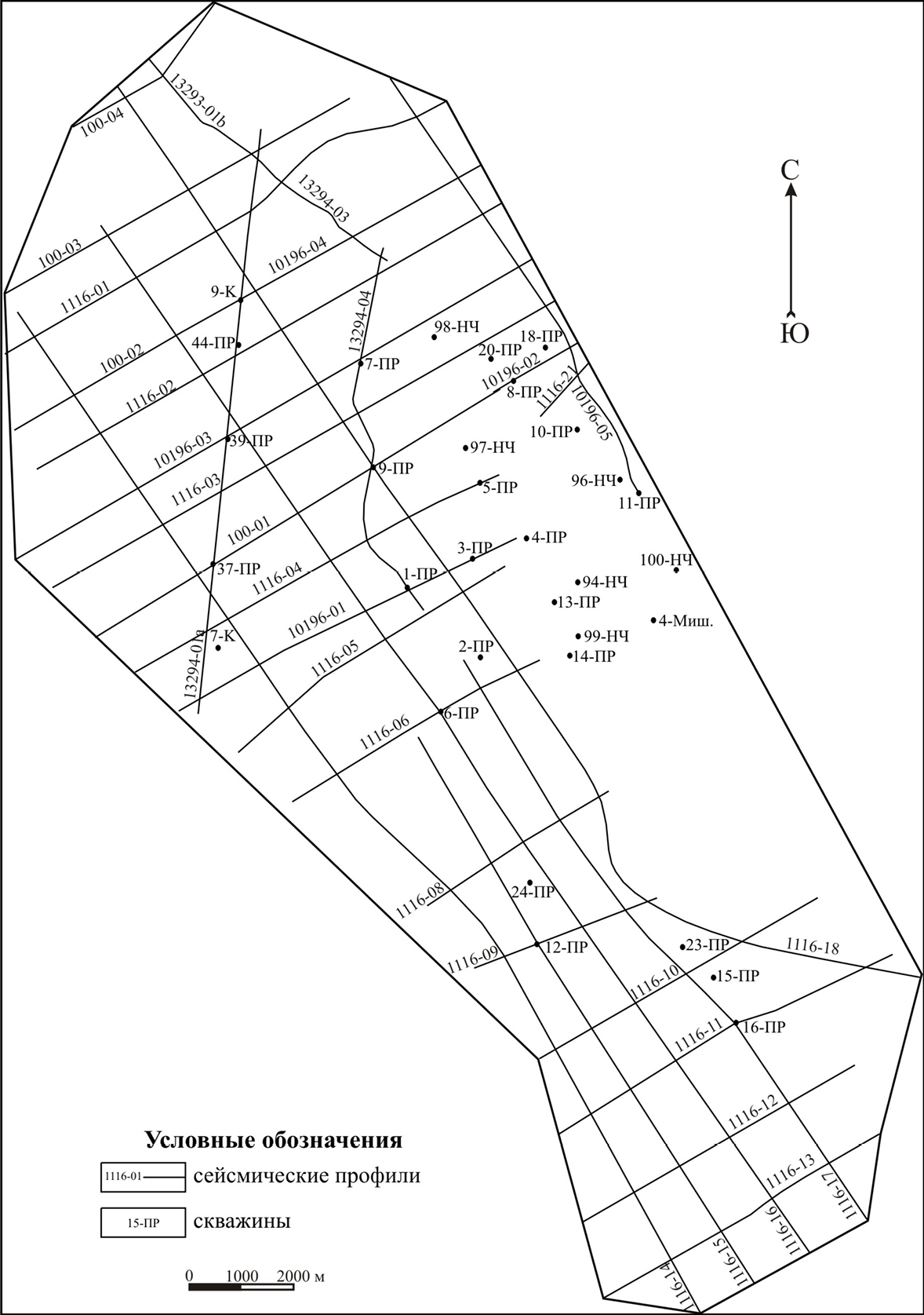 Трассировка тектонических нарушений по разрезу осуществлялась по краевым точкам изгибов, сопровождающихся разрушением осей синфазности и их «скачками» во временах регистрации. В отдельных случаях основные нарушения осложнены серией малоамплитудных сбросов более мелкого ранга, трассирование их по профилям, особенно в субмеридиональном направлении, затруднено. С целью трассирования элементов разрывной тектоники в плане вначале были протрассированы основные, так называемые генерализованные направления разломов, а затем выделены нарушения более мелкого ранга, согласованные с основными. Линии дизъюнктивных дислокаций в плане имеют криволинейную форму с преобладающим субмеридиональным направлением.