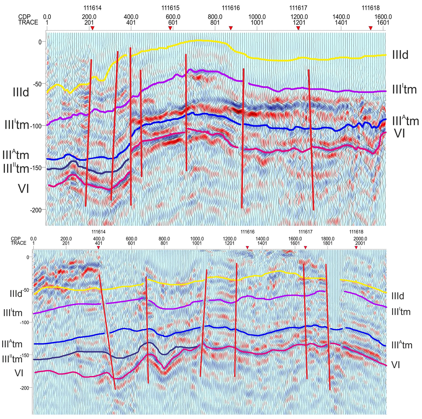 Рисунок 4. Фрагменты временных разрезов по профилям 1116-08 (сверху), 1116-06 (снизу) с выделением зон предполагаемых разломов [10]; местоположение профилей см. на рис. 3.