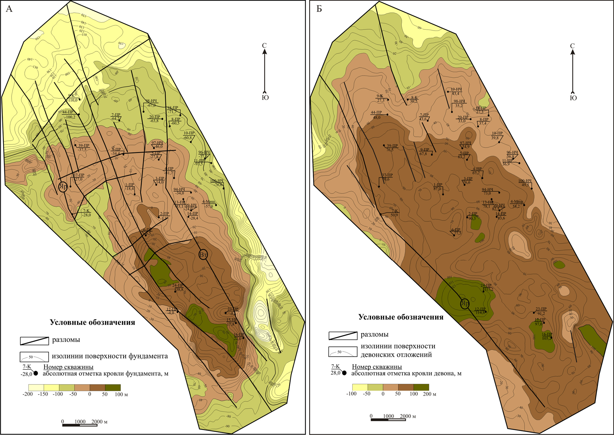 Рисунок 5. А – схема изолиний поверхностей рифейского фундамента; Б – девонских отложений (по [8–10] с дополнениями авторов).