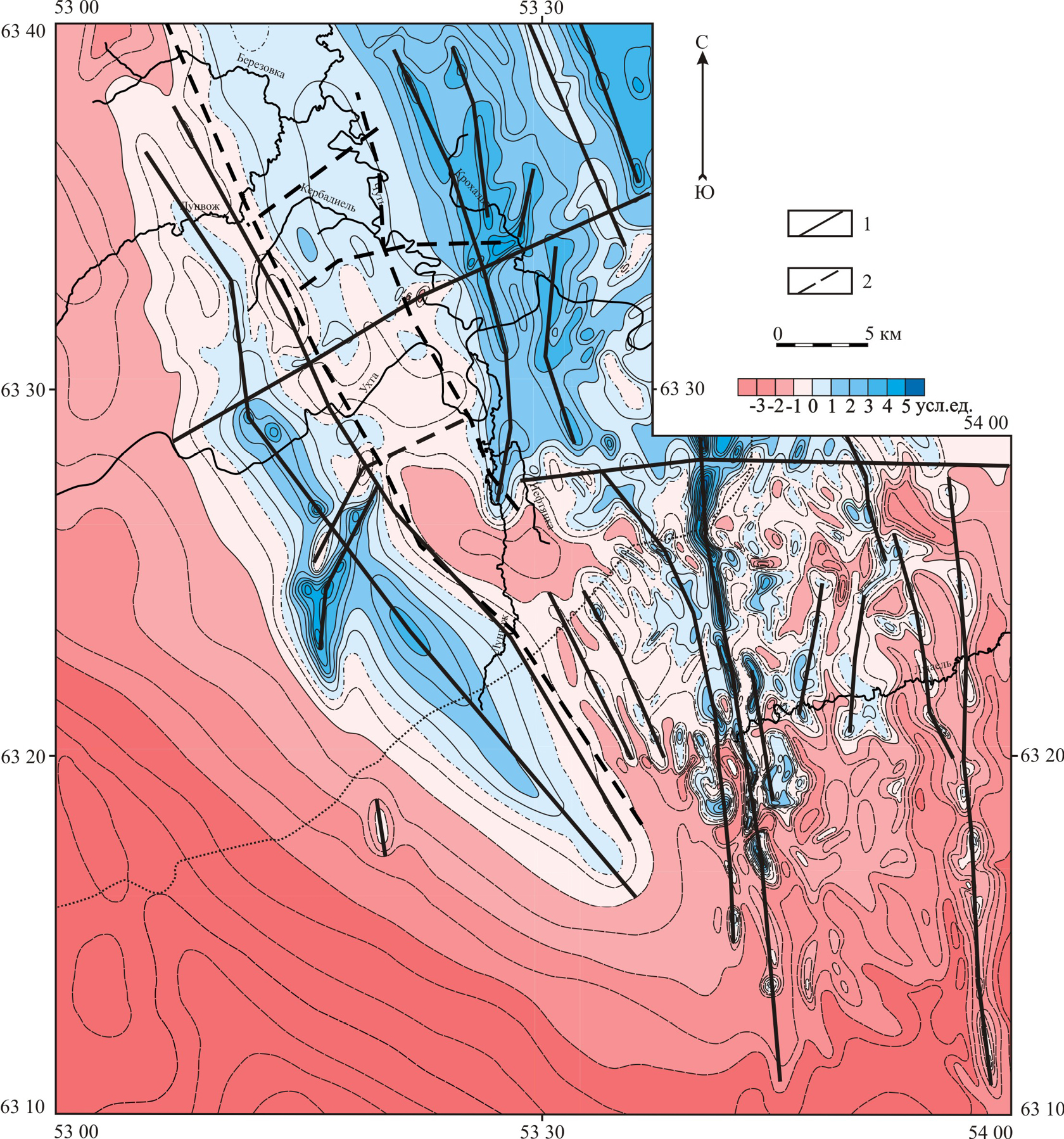 Рисунок 6. Карта аномального магнитного поля масштаба 1:50 000 (составлена по [3] с дополнениями авторов). Условные обозначения: 1 – линеаменты аномального магнитного поля; 2 – разломы, выделенные по данным сейсморазведки.
