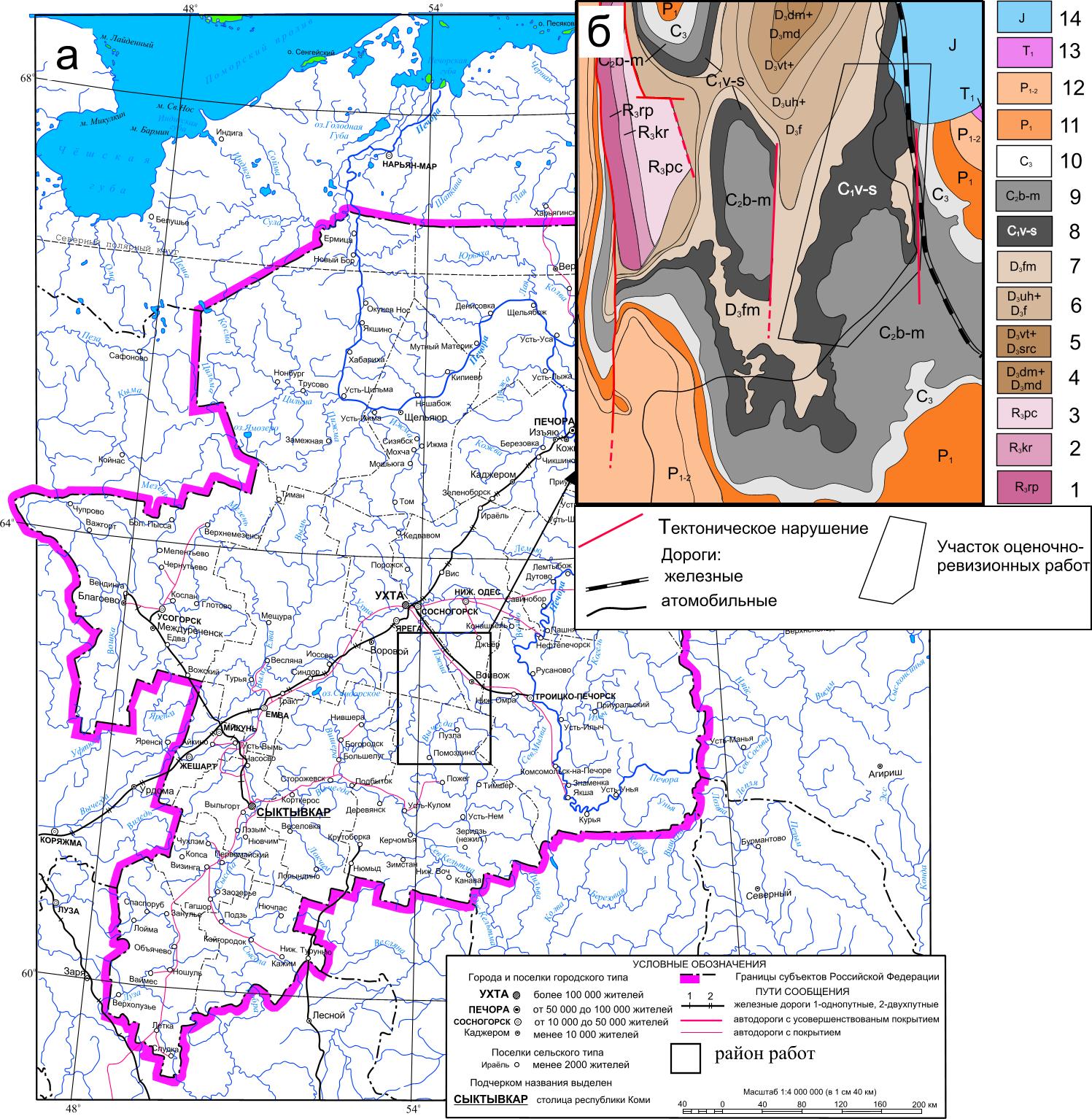 Рисунок. 1. Местонахождения района работ (а) и фрагмент геологической карты, по материалам Ю.К. Крылова [3], с обозначенным участком работ (б). Условные обозначения: 1 – ропчинская свита верхнего рифея; 2 – кислоручейская свита верхнего рифея; 3 – потчурская свита верхнего рифея; 4 – мендымская и доманиковая свиты верхнего девона; 5 – ветласянская и сирачойская свиты верхнего девона; 6 – ухтинская свита и нерасчлененные отложения франского яруса верхнего девона; 7 – фаменский ярус верхнего девона; 8 – визейский и серпуховский ярусы нижнего карбона нерасчлененные; 9 – башкирский и московский ярусы среднего карбона; 10 – нерасчлененный верхний отдел каменноугольной системы; 11 – нижний отдел пермской системы нерасчлененный; 12 – уфимский и казанский ярусы нижнего и среднего отделов пермской системы; 13 – нижний отдел триасовой системы; 14 – юрская система.
