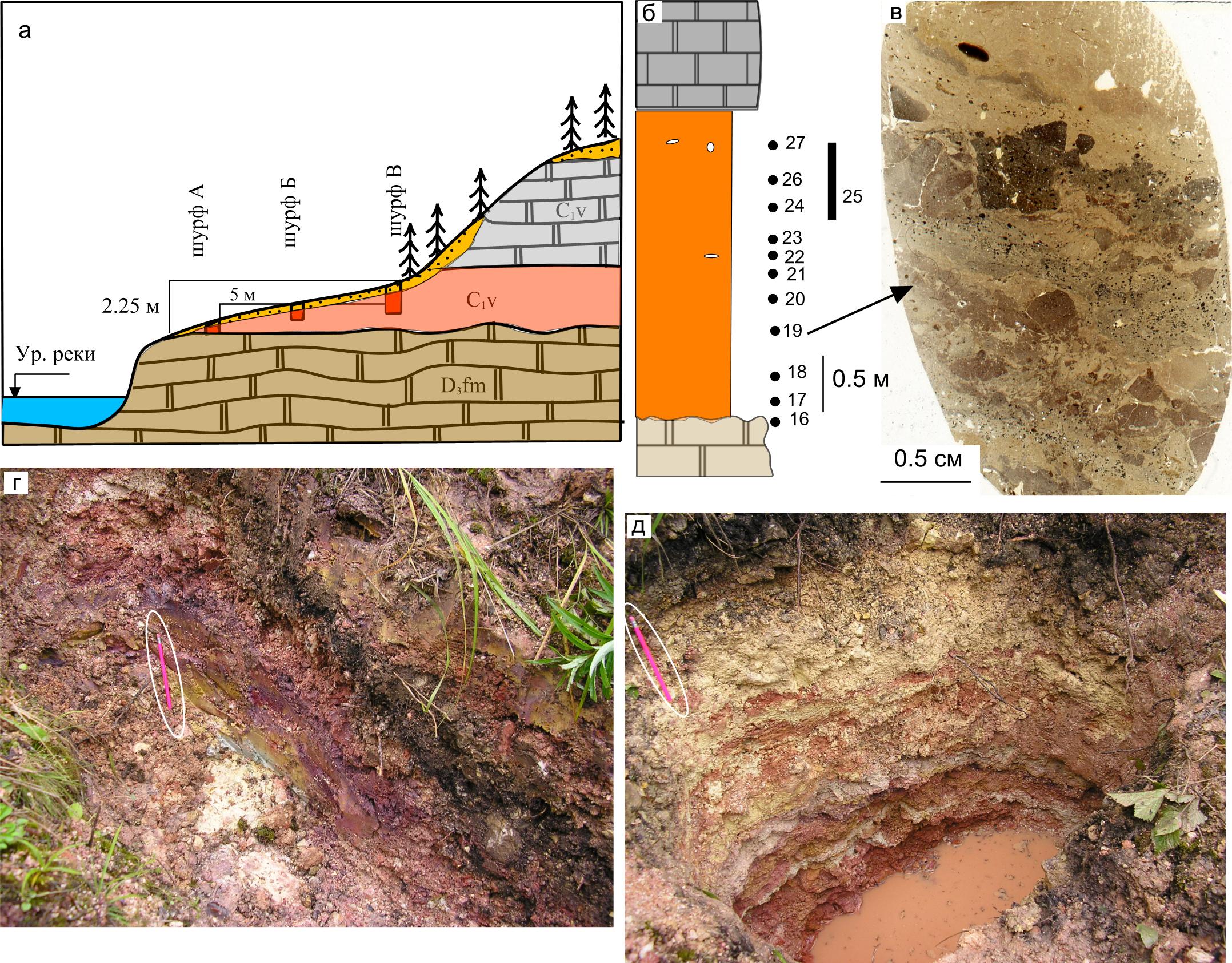 Рисунок 7. Нижневизейские каолины в профиле № 14 на правом берегу р. Черь Ижемской: а – литологическая колонка; б – схема расположения шурфов; в – доломитовые обломки в кирпично-красной глине на границе с верхним девоном в нижней части шурфа А (длина линейки – 22 см); г – зеркала скольжения на белой поверхности разноцветных аргиллитов в шурфе В, д – слоисто-окрашенные кирпично-красные и белые каолиниты в северо-западной стенке шурфа Г (длина ручки молотка – 50 см); е – пизолитовая структура в основании слоя фиолетовых аргиллитов в шурфе Б; ж – разноцветные аргиллиты с псефитовой структурой в шурфе В; з – обломочная структура в аргиллитах в шурфе В (сканированный шлиф).