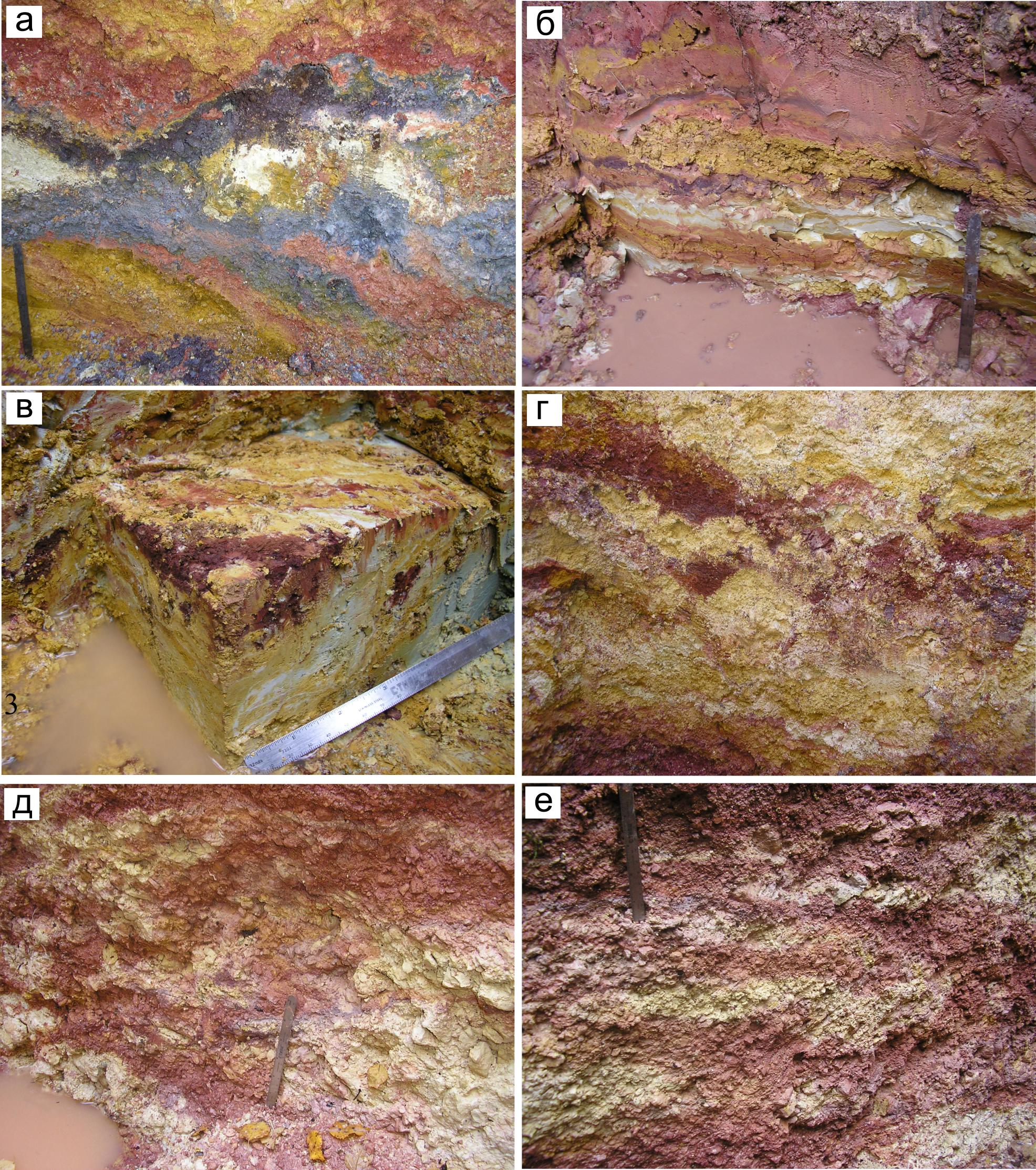 Этот характерный литологический признак – отсутствие слоистости с четкими напластованиями – в целом типичен для строения каолинитовой толщи Изъюръельского проявления. Однако встречаются интервалы разрезов, сложенные глинистыми породами, образующими пластообразные тела, по крайней мере, на протяжении стенок шурфа или канавы. Эти пласты толщиной 5–40 см выражены чередованием красных, белых, желтых и бордовых глинистых пород. Отмечаются слои с относительно правильной формой и выдержанной мощностью (рис. 6, д; 8, б), а чаще неправильной формы (рис. 5, в; 7, д; 8, г, е). Так как в ходе изучения строения каолинитовой толщи не обнаружен ни один какой-либо литологический репер, даже в находящихся рядом горных выработках, можно предположить, что наблюдаемые тела имеют удлиненно-линзовидную форму.