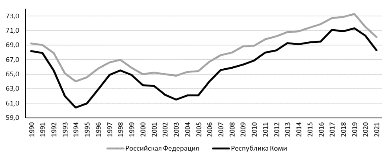 Figure 5. Dynamics of the population life expectancy in the Russian Federation and the Komi Republic for 1990-2021, years.
