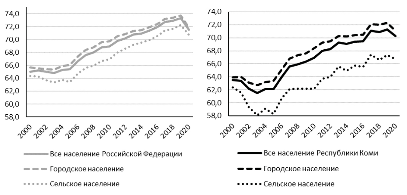 Рисунок 6. Динамика ожидаемой продолжительности жизни городского и сельского населения Российской Федерации и Республики Коми в 2000–2020 годах, лет.
