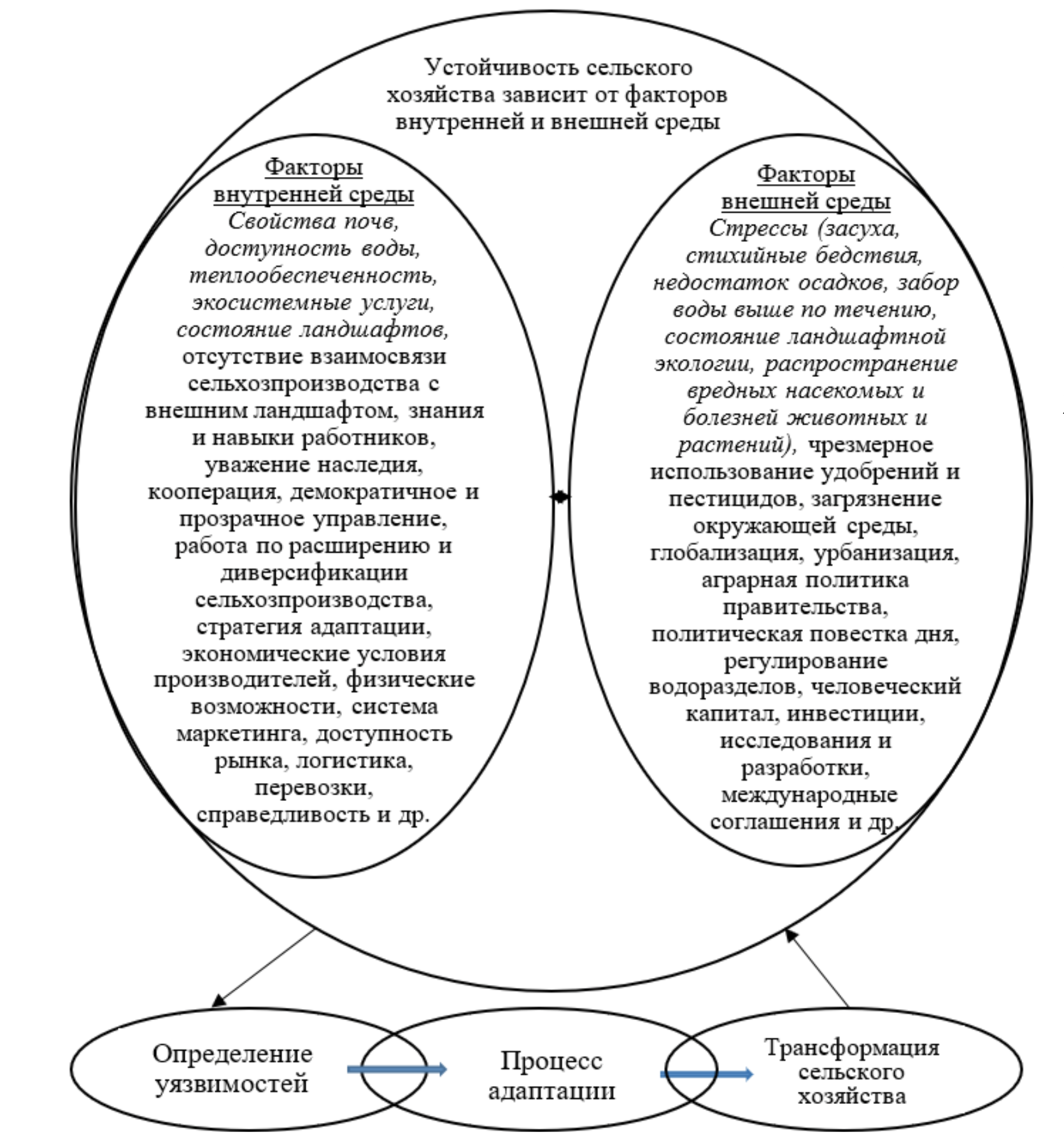 Устойчивое развитие – это сложный процесс, включающий множество факторов, которые в широком смысле соответствуют экономическим, социальным и экологическим областям. Устойчивость сельского хозяйства зависит от состояния факторов внешней и внутренней систем, включая выявление и управление уязвимостями, адаптацию (способность, потенциал) аграрного производства и его трансформацией.
