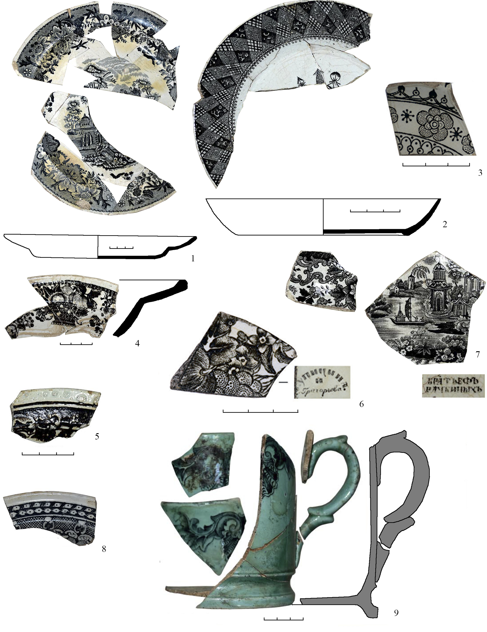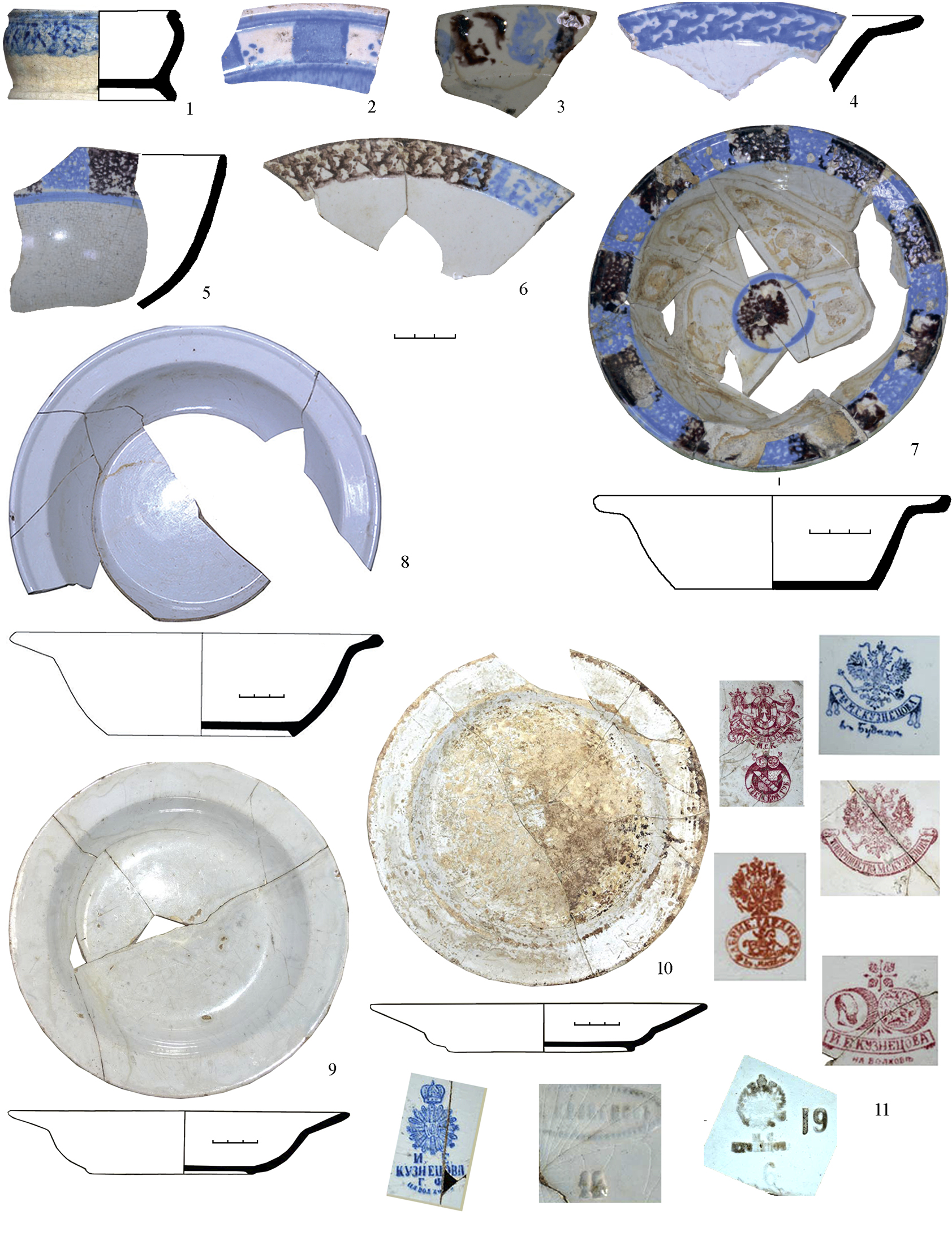 Фаянсовая и фарфоровая посуда в основном представлена фрагментами и целыми формами столовой посуды: разнообразными тарелками, блюдцами, чашками и чайниками, молочниками, супницами, попадаются помадные банки. В верхних слоях некоторых объектов иногда встречаются советские клейма, например, Тверской фабрики (Конаково) и т.д. В дореволюционных объектах имеются клейма различных фабрик: И.Е. и М.С. Кузнецовых, Ф.Я. Гарднера и других середины XIX – начала XX в. (таблица).