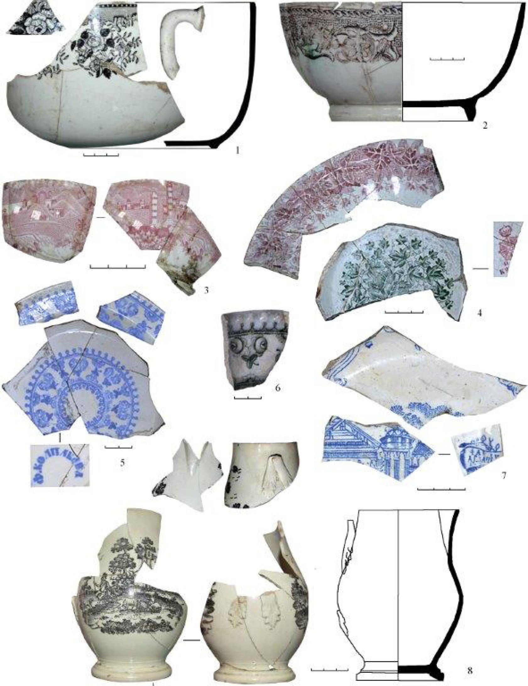 Интересен еще один вид орнамента (39 экз.). На первый взгляд, кажется, что борта посуды украшены полосой пятен синего цвета. Иногда посуда украшена двумя чередующимися цветами: синим и коричневым. Но если присмотреться, то можно увидеть на тарелках два силуэта, повторяющихся или слегка видоизмененных. Лучше всего силуэт заметен на салатнике (рис. 2, 8) – он выполнен коричневым цветом и четко разделен на два силуэта. На фрагменте тарелки (рис. 2, 3) также можно их обнаружить, но уже не в таком «чистом» исполнении. На других фрагментах этот сюжет уже сглажен или даже несколько раз нанесен на одно и то же место. В итоге мы имеем посуду с нанесенными беспорядочными пятнами (рис. 2, 1, 4–7). Происхождение этой посуды автору неизвестно. При анализе материала из объектов на ул. Красной удалось определить, что посуда с таким декором бытовала и во второй половине XIX в., и на рубеже XIX–XX вв.