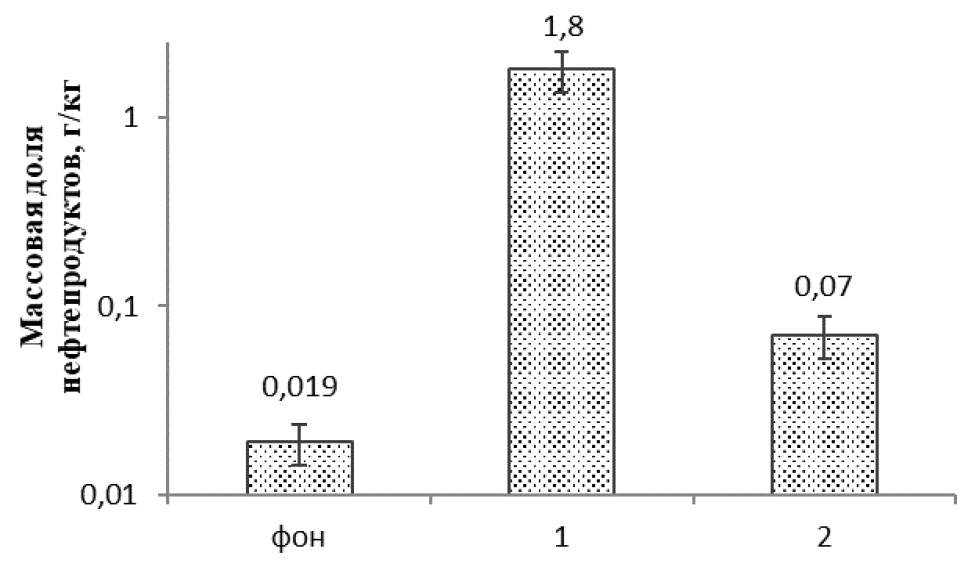 На участок песчаной почвы (НП=0.011 г/кг) сухой осадок, обработанный биогеосорбентом, вносили под вспашку на глубину 50 см. Спустя 30 сут содержание НП в почве участка составило 1.4 г/кг, что не превышало допустимого остаточного содержания нефти (далее – ДОСНП). Параллельно очищенный щебень складировали на поверхности грунта (НП=0.019 г/кг). Спустя 12 месяцев провели анализ почвы на содержание НП под щебнем (рис. 1).