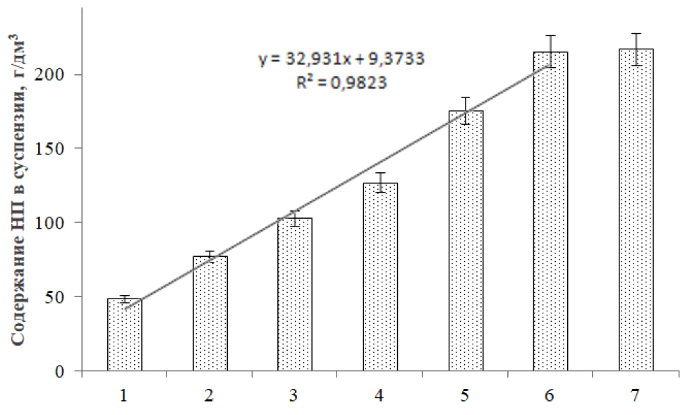 При проведении исследований эффективности очистки щебеночного балласта при многократном использовании суспензии биогеосорбента было отмечено, что эффект накопления НП наблюдался в течение шести циклов (рис. 2). Накопление отмытых загрязнений в суспензии свыше 200 г/дм3 резко ухудшало ее действие: при визуальном контроле щебня после шестого и седьмого циклов изменений не фиксировали. Зависимость содержания НП в суспензии от количества циклов загрузки (в диапазоне до шести циклов) наилучшим образом описывает линейная функция (уравнение 1):
