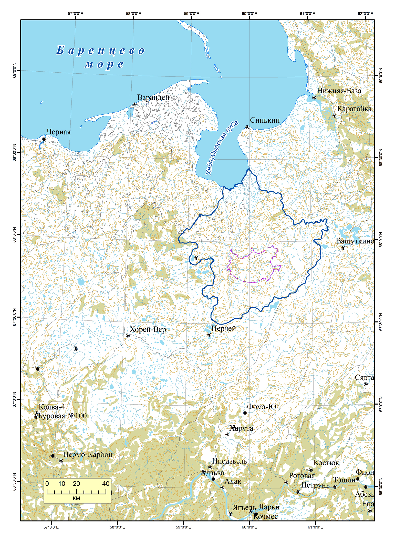 Рисунок 1. Локализация бассейна реки Море-Ю. На водосборе показаны границы заказника «Море-Ю».