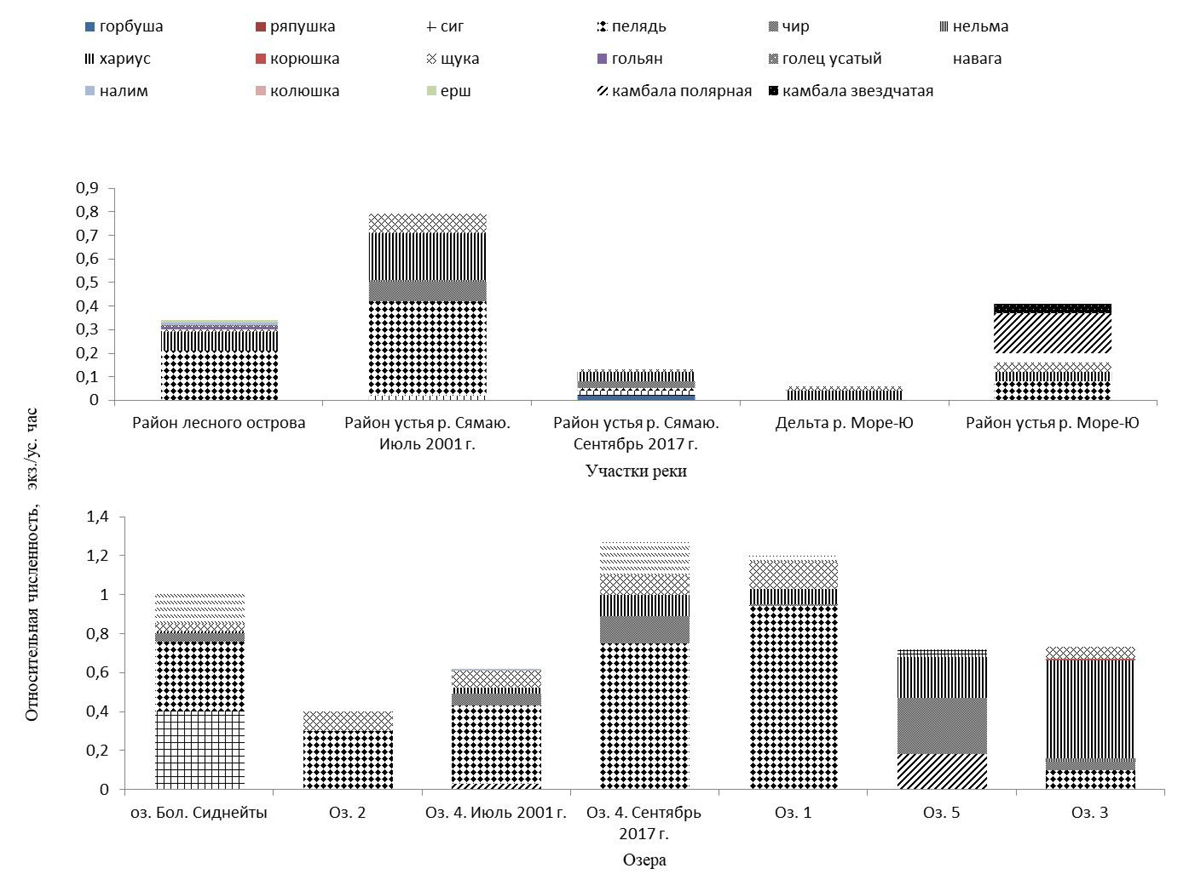 Как видно из таблиц, в работе в разные сезоны года охарактеризовано рыбное население достаточно контрастных участков русла реки и разнотипных озер, расположенных в различных районах водосбора реки. Изучены ее равнинные участки в среднем и нижнем течениях (за исключением верхнего течения, имеющего выраженный полугорный характер). Протяженность исследованного участка р. Море-Ю составила около 100 км, от реликтового «лесного острова», располагающегося на протяжении более 10 км выше по течению устья р. Сямаю, до места впадения водотока в Хайпудырскую губу Баренцева моря. Изучение рыбного населения русла водотока выполнено преимущественно в июле 2004 г., в процессе сплава по реке на надувных лодках от точки 1р (см. рис. 2) до дельты и устья. В сентябре 2017 г. повторно проведены сборы в районе устья р. Сямаю.