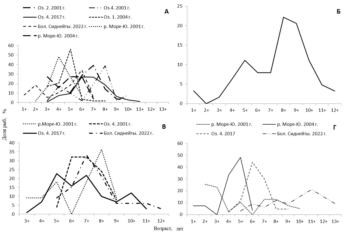 Figure 7. Age structure of caught fish species n the More-Yu River course and lakes: A - peled; Б – whitefish; В – broad whitefish; Г – grayling.