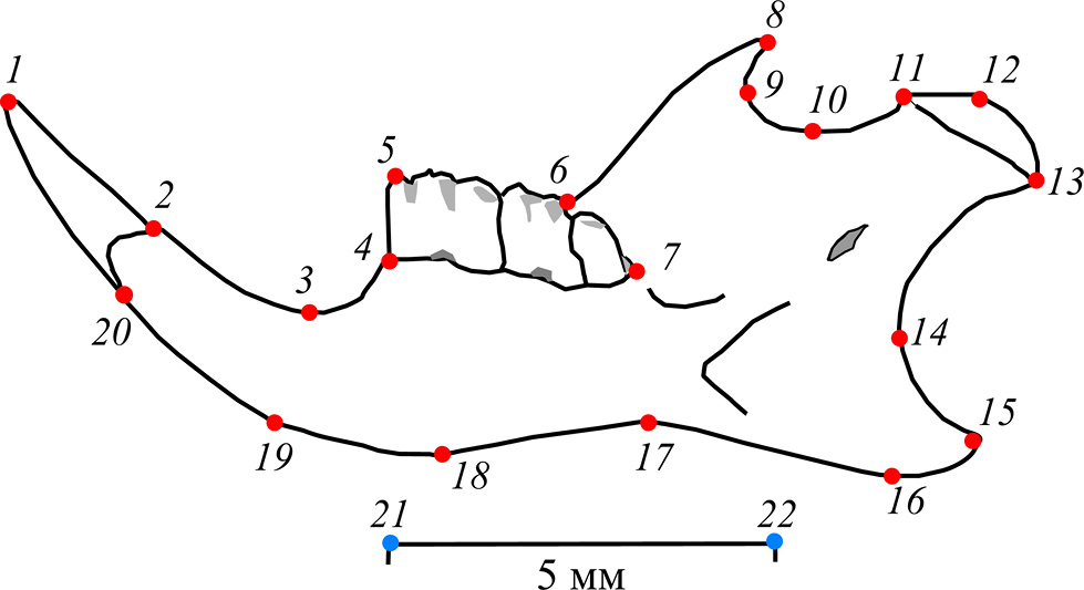 Для сравнения формы и размеров нижней челюсти применили методы геометрической морфометрии с использованием фотографий правых ветвей нижней челюсти линейных мышей с лингвальной стороны, полученных с помощью планшетного сканера Epson при постоянном оптическом разрешении 1200 dpi. На изображениях с помощью компьютерных программ Ф.Дж. Рольфа tpsUtil [33] и tpsDig2 [34] поместили конфигурации из 20 основных гомологичных и двух дополнительных масштабирующих меток-ландмарок (landmarks), позволяющих характеризовать изменчивость формы нижней челюсти (рис. 1), а также ее центроидного размера, выраженного в мм.