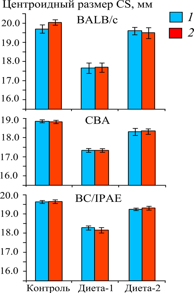 Рисунок 2. Сравнение средних центроидных размеров (CS) с учетом величин стандартных ошибок (±SE) между контрольными (контроль) и экспериментальными («диета-1», «диета-2») выборками самцов (1) и самок (2) трех линий мышей.