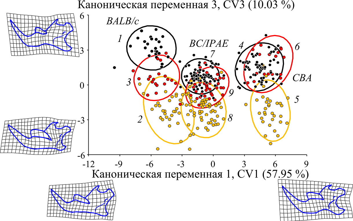 На первую каноническую переменную CV1 пришлось около 55 % межгрупповой дисперсии, причем, на рис. 3 видно, что вдоль этой оси отчетливо проявились основные межлинейные (генотипические) различия: слева расположены эллипсоиды изменчивости линии BALB/c, справа – линии CBA, а промежуточное положение между ними занимает линия BC/IPAE.