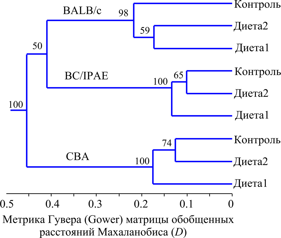 Figure 5. The results of cluster analysis (UPGMA) of the matrix of generalized Mahalanobis distances (D) in view of the Gower metric agreed between samples of control and experimental groups of mice. The nodes of the clusters’ branches indicate the values of their support based on bootstrap estimates, %.