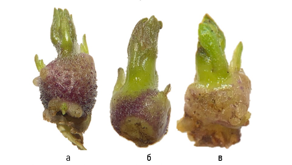 Figure 1. The initial potato explant (eyeholes) before introduction to in vitro culture: a - Pechorsky variety; б - Zyryanets variety; в - Vychegodsky variety.