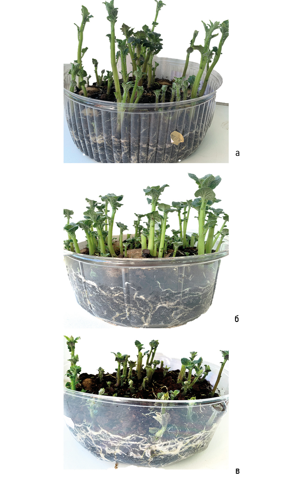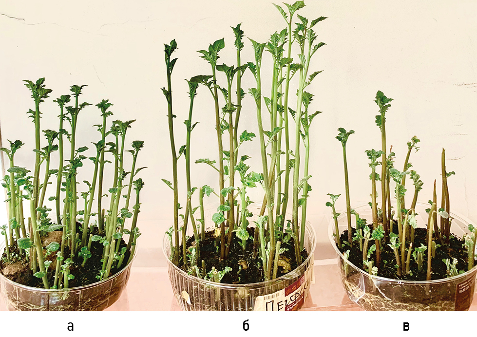 Figure 2. 14-day-old potato plants: a - Pechorsky variety; б – Vychegodsky variety; в - Zyryanets variety.
