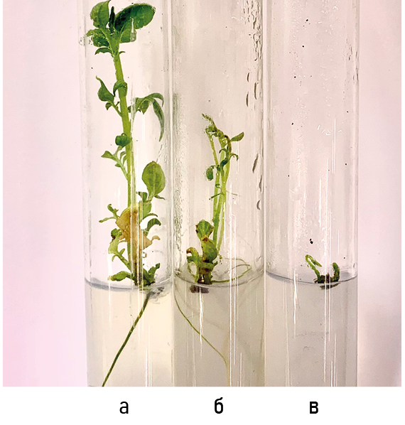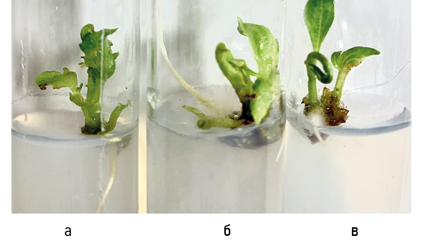 Figure 7. In vitro formation of potato microshoots from isolated shoot tops in 20 days from the beginning of cultivation: a – Vychegodsky variety; б – Zyryanets variety; в – Pechorsky variety.