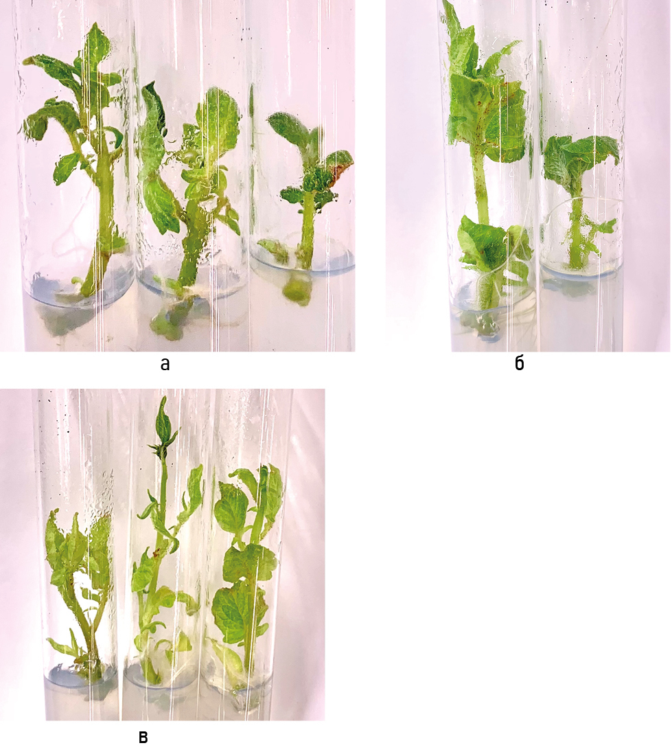 Figure 6. In vitro formation of potato microshoots from isolated cuttings in 20 days from the beginning of cultivation: a – Vychegodsky variety; б – Zyryanets variety; в – Pechorsky variety.