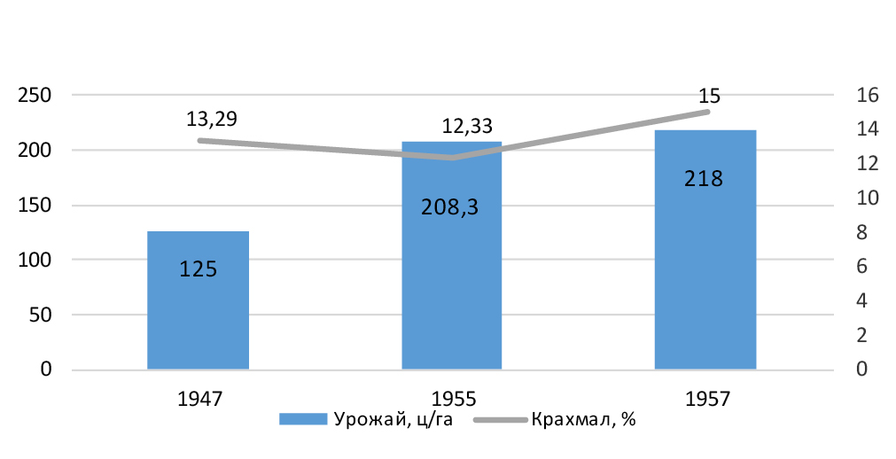 Доказана возможность повышения крахмалистости картофеля до 15 % в опытах 1945 г. Причиной изучения крахмалистости картофеля явилось его низкое содержание в клубнях – 8–11 %. Результаты исследований показали большее содержание крахмала в крупных клубнях, по сравнению с мелкими, и в картофеле наиболее ранних сроков посадки [4].