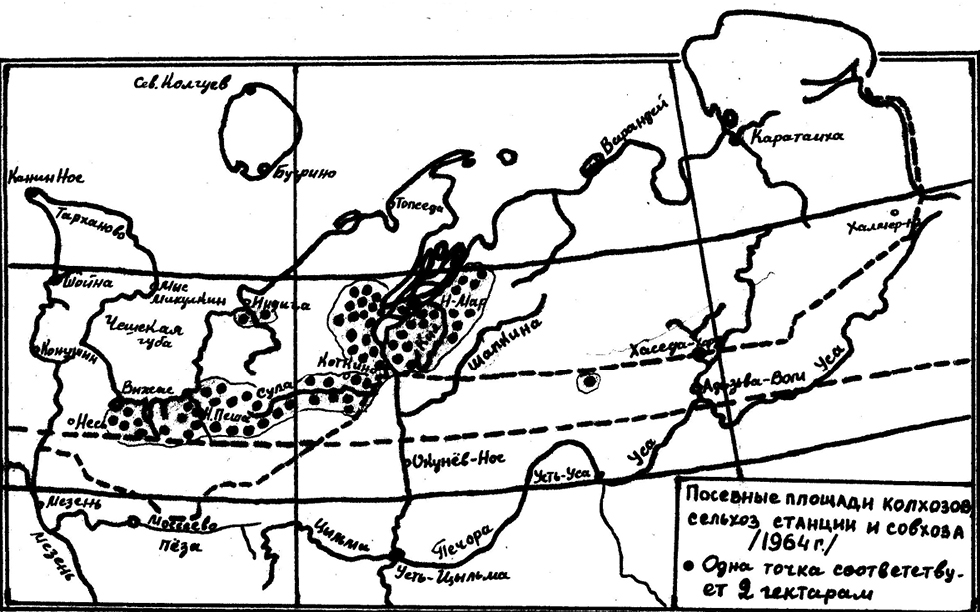 Figure 2. Areas of agriculture and horticulture on the territory of the Nenets District, 1964 [Map from the Archives of the Naryan-Mar Agricultural Experimental Station, Department of Economics].