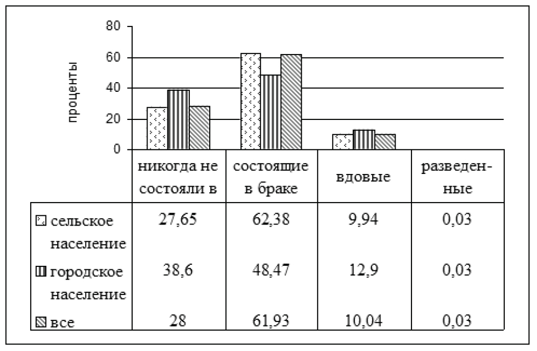 Для изучаемого населения была характерна этнорегиональная специфика ряда параметров, относящихся к браку. Это и относительно высокий брачный возраст, и довольно растяжимая возрастная разница между супругами, отсутствие устойчивых традиций браков между вдовыми, выраженный дефицит мужского населения в основных брачных возрастах и др. [5]. Как показывает рисунок, преобладающая доля населения Коми края в конце XIX в. состояла в браке. В сельской местности удельный вес этой категории населения был заметно выше, чем в городской. Доля вдовых среди сельских жителей была не намного, но ниже, чем среди городских. Показатели категории «никогда не состоявшие в браке» среди городского населения были более высокими.