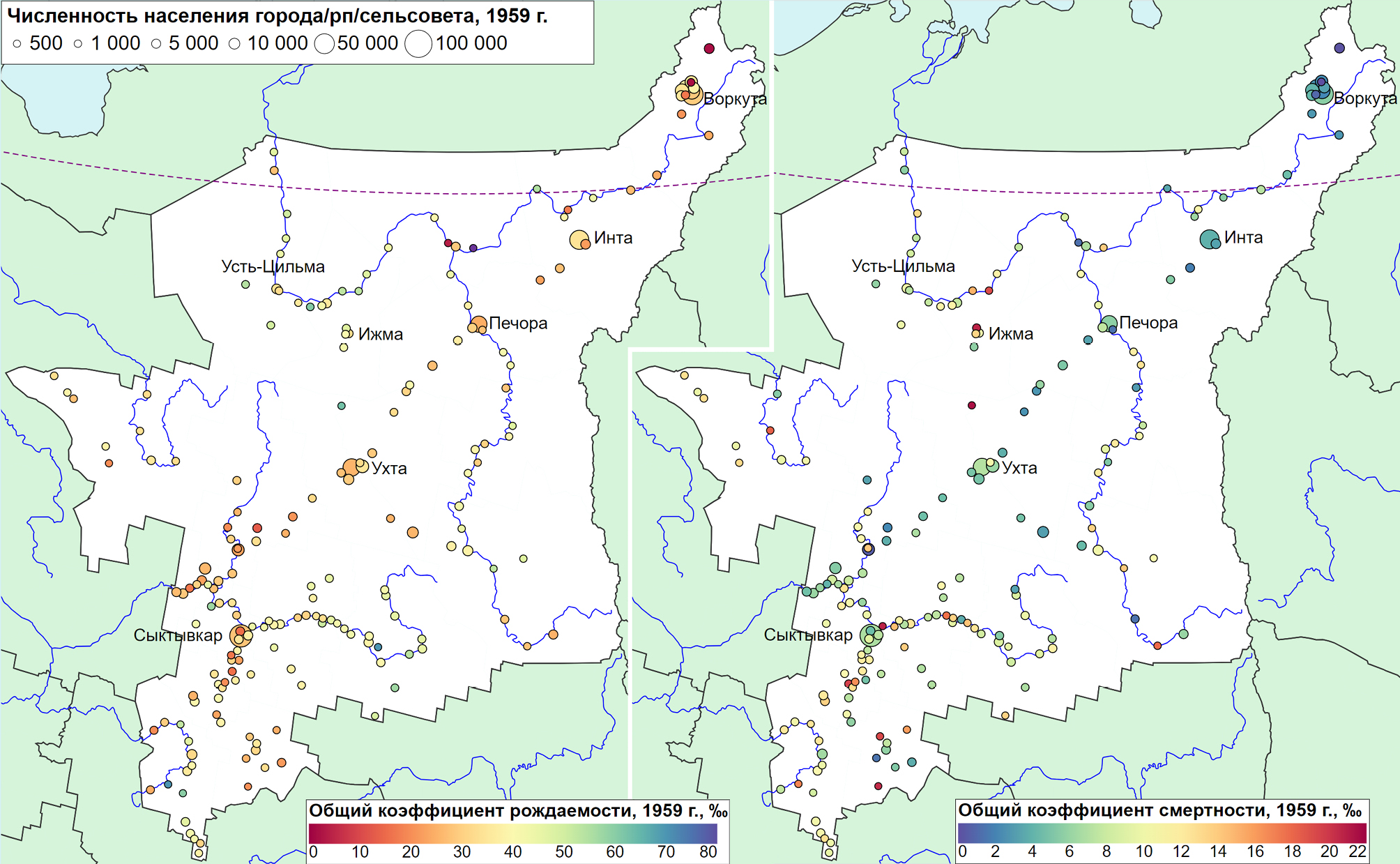 Рассмотрим территориальные различия в рождаемости и смертности за 1959 г. на местном уровне. На карте-схеме отмечены 194 точки (рисунок). Из них пять соответствуют городам (Сыктывкар, Воркута, Инта, Печора, Ухта), 29 – рабочим поселкам (Горняцкий, Промышленный, Комсомольский, Северный, Железнодорожный, Микунь, Войвож, Октябрьский, Заполярный, Ярега, Хальмер-Ю, Верхняя Инта, Кожва, Краснозатонский, Каджером, Нижняя Омра, Вожаель, Кожым, Тракт, Кажым, Водный, Елецкий, Хановей, Мульда, Абезь, Косью, Нювчим, Ошкурья, Кырта), 160 – сельским советам. Медианная численность населения города – 40.6 тыс. чел., рабочего поселка – 5.5 тыс., сельского совета – 1.8 тыс.