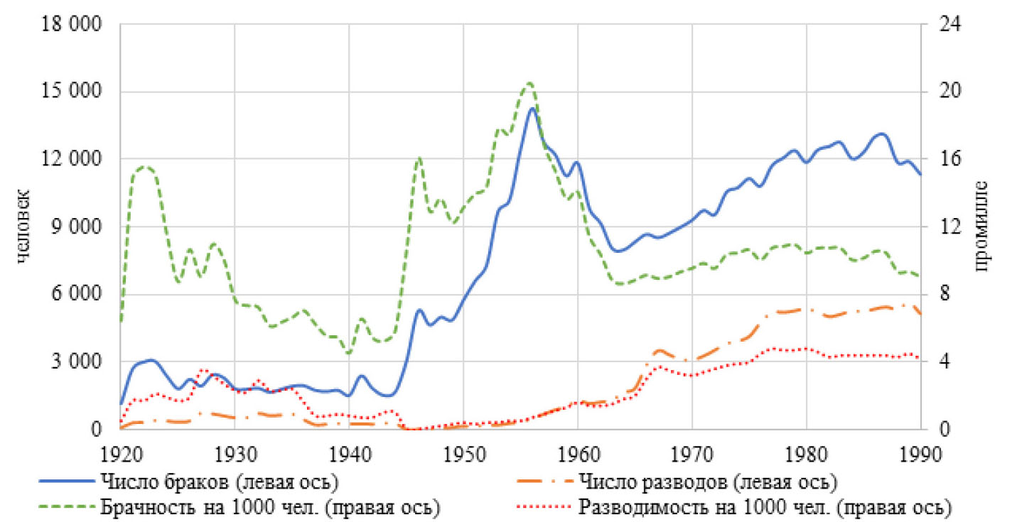 Брачность и разводимость населения Республики Коми в 1920-1980-е годы