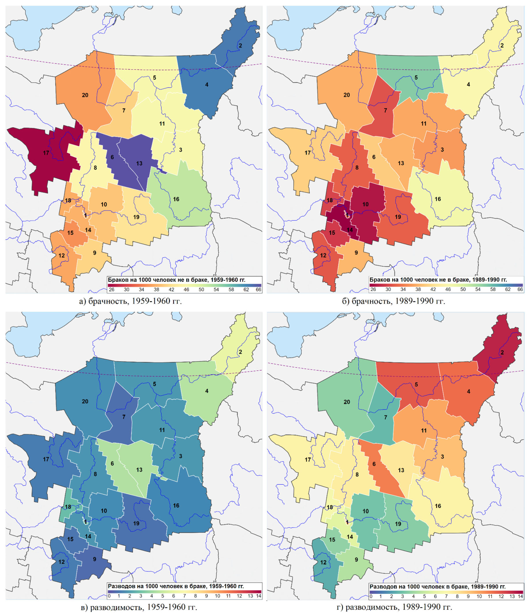 В целях выявления пространственных закономерностей в брачном составе населения, брачности и разводимости построены фоновые картограммы. Для удобства административно-территориальное деление республики приведено к современному. В 1989 г. города Печора и Усинск рассматриваются вместе с Печорским и Усинским районами соответственно. Для приведения деления 1959 г. к виду, близкому к современному, потребовалось больше изменений. Железнодорожный район рассмотрен в границах Княжпогостского, Сторожевский объединен с Корткеросским, Летский – с Прилузским, Помоздинский – с Усть-Куломским. Усинский и Вуктыльский районы на картах 1959 г. закрашены в цвета Печорского района, а Сосногорский – в цвета Ухтинского горсовета.