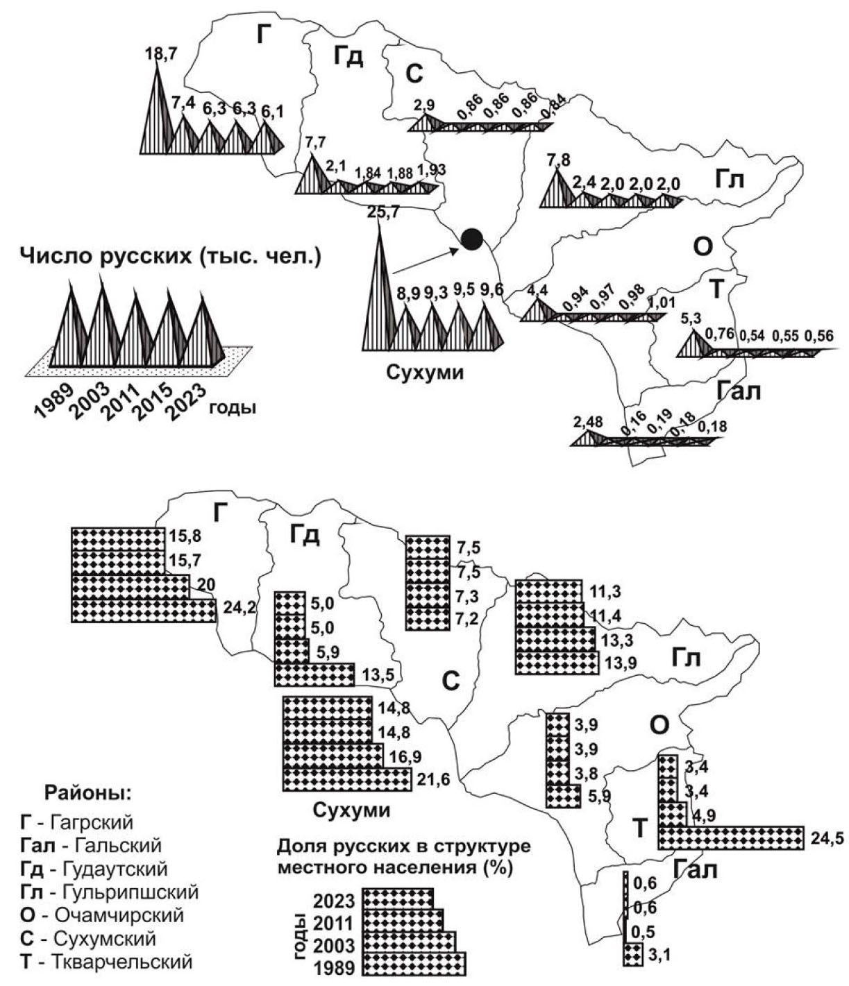 При общей 3-кратной демографической убыли русского населения в 1990-е гг. еще отчетливее обозначились два эпицентра его системы расселения – столица и Гагрский район. В начале 2000-х гг. на них приходилось уже почти 70 % русских Абхазии, которые таким образом, оставив значительную часть поселенческой сети республики, в нараставшей степени концентрировались в Сухуми (единственном крупном городе республики) и на территориях, прилегающих к Российской Федерации.