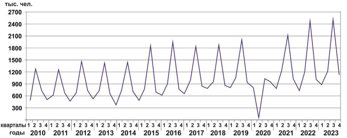 Fig. 3. Dynamics of the Russian tourist flow to Abkhazia by yearand quarter, 2010-2023 (thousand people)
