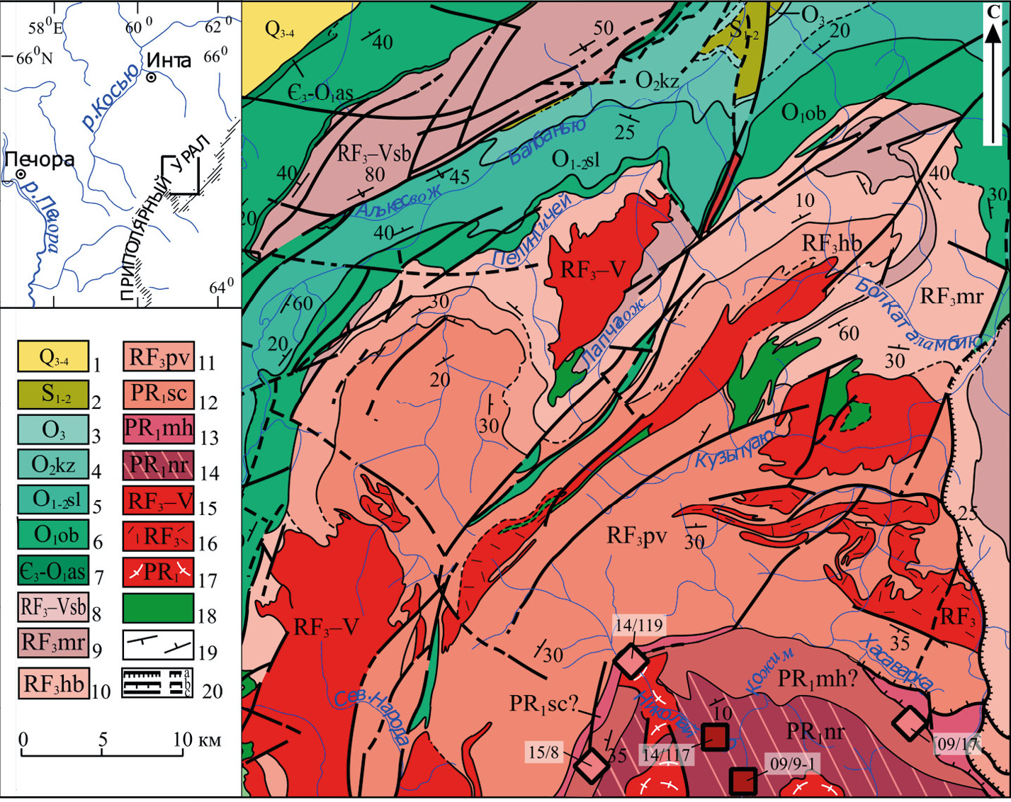 Условные обозначения: 1 – верхнечетвертичные-современные отложения (Q3-4), 2 – силурийские отложения (S1-2), 3 – верхнеордовикские отложения (O3), 4 – кожимская свита (O2), 5 – саледская свита (O1-2), 6 – обеизская свита (O1), 7 – алькесвожская толща (Є3-O1), 8 – саблегорская свита (RF3–V), 9 – мороинская свита (RF3), 10 – хобеинская свита (RF3), 11 – пуйвинская свита (RF3), 12 – щокурьинская свита (PR1), 13 – маньхобеинская свита (PR1), 14 – няртинский комплекс (PR1), 15–17 – гранитоидные комплексы: 15 – сальнеро-маньхамбовский (RF3–V), 16 – кожимский (RF3), 17 – николайшорский (PR1), 18 – хаталамбинский габбро-долеритовый комплекс (RF3–V), 19 – элементы залегания плоскостных структур (слоистости, полосчатости, сланцеватости), 20 – тектонические границы: a – шарьяжи и надвиги, b – всбросы и сбросы, c – крутопадающие дизъюнктивы.