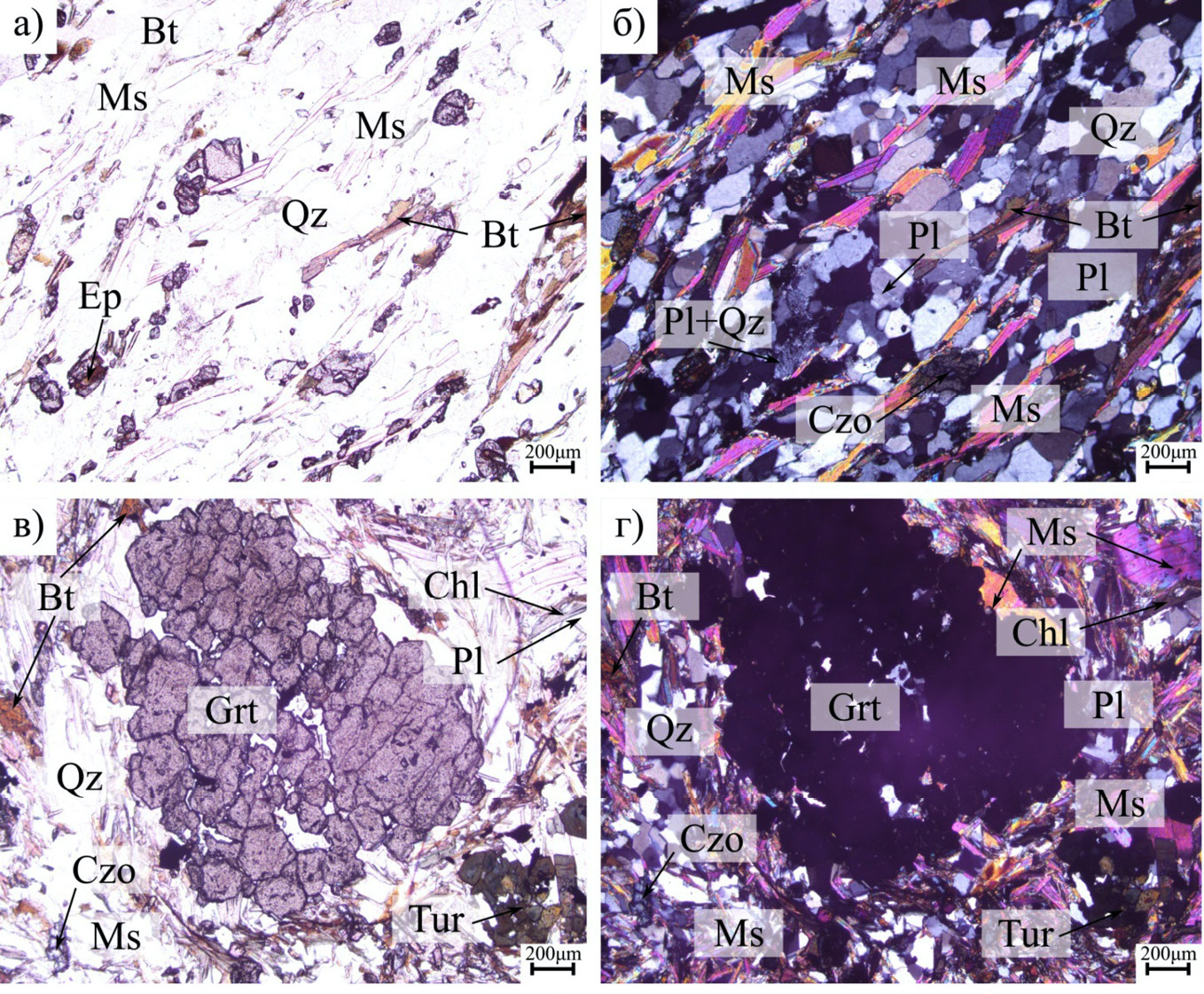 Figure 3. Microphotographs of paragneiss slides from the Nyartinskiy complex (sample14/117 – a, б) and the Mankhobeinskaya suite (sample 09/17 – в, г). Mineral symbols: Bt – biotite, Czo – clinozoisite, Grt – garnet, Ms – muscovite, Pl – plagioclase, Tur – tourmaline, Qz – quartz
