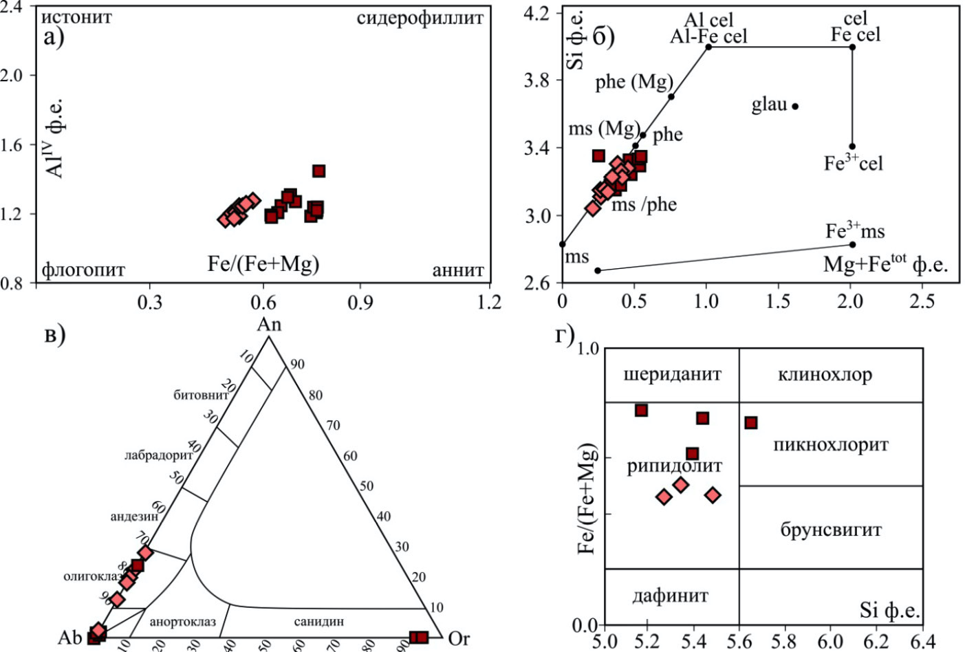 Figure 4. Chemical compositions of minerals: a) (Fe/(Fe+Mg)-AlIV) f.u. for biotites; б) Mg+Fe f.u.-Si f.u. for muscovites (according to [15]); в) plagioclases; г) Si-(Fe/(Fe+Mg) f.u. for chlorites [16]
