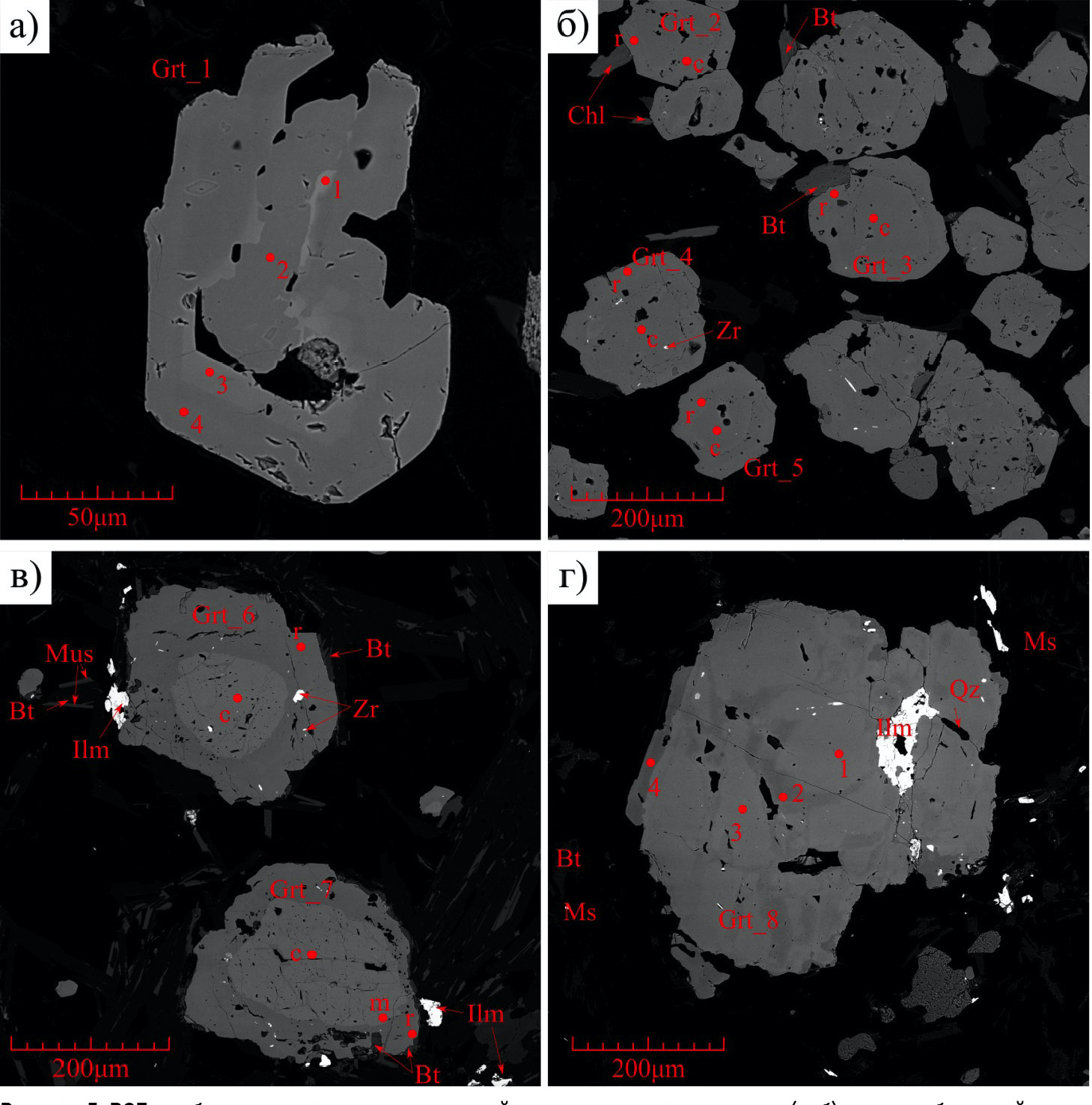В изученных нами образцах к ранним минералам с определенной долей вероятности можно отнести пироп-альмандиновые ядра регрессивно-зональных гранатов и гранаты со сложной зональностью.