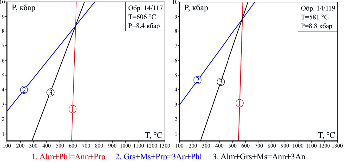 Дополнительно для оценки достоверности полученных результатов были определены пиковая температура и давление методом мультиравновесной термобарометрии с использованием программ TWQ и TWQ_View, написанных Д. В. Доливо-Добровольским. Три независимых реакции, описывающие Grt-Bt термометр (реакция Alm+Phl=Ann+Prp) и Gr-Bt-Ms-Pl геобарометр (Alm+Grs+Ms=Ann+3Ann; Grs+Ms+Prp=3An+Phl), указывают на неплохую сходимость с данными классической термобарометрии (рис. 6). Полученные значения для образца няртинского комплекса (14/117) соответствуют T=606 °C и P=8.4 кбар, для образца маньхобеинской свиты (14/119) – T=581 °C, P=8.8 кбар.