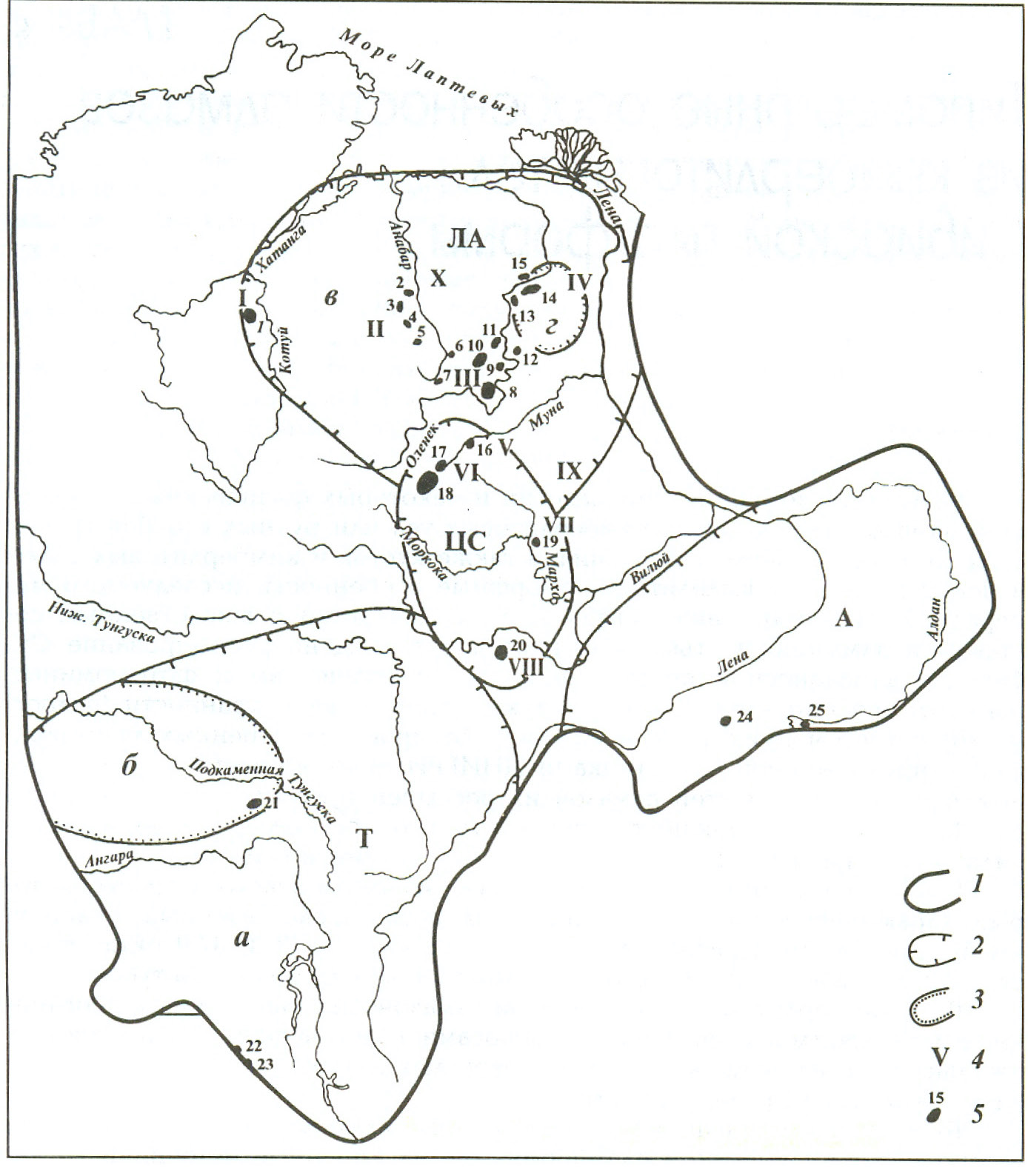 Symbols: 1-3 - boundaries: 1 – the Siberian diamondiferous province, 2 - subprovinces (CS - Central Siberian, LA - Leno-Anabar, T - Tunguska, A - Aldan), 3 - regions (a - Sayan-Tunguska, б - Baikit, в - Anabar-Olenek, г - Kyutyungdinskaya); 4 - diamondiferous areas: I - Kotuy-Meimechinsky, II - Kuonapsky, III - Sredneoleneksky, IV - Nizhneoleneksky, V - Verkhnemunsky, VI - Daldyno-Alakitsky, VII - Srednemarkhinsky, VIII - Malobotuobinsky, IX - Morkokinsky, X – Anabar; 5 - kimberlite fields: 1 - Kotuy-Meimechinskoe, 2 - Orto-Yarginskoe, 3 - Starorechenskoe, 4 - Ary-Mastakhskoe, 5 - Dyukenskoe, 6 - Luchakanskoe, 7 - Kuranakhskoe, 8 - Chomurdakhskoe, 9 - Ogoner-Yuryakhskoe, 10 - Zapadno-Ukukitskoe, 11 - Vostochno-Ukukitskoe, 12 - Verkhnemotorchunskoe, 13 - Merchimdenskoe, 14 - Verkhnemolodinskoe, 15 - Kuoikskoe, 16 - Verkhnemunskoe, 17 - Daldynskoe, 18 - Alakit-Markhinskoe, 19 - Nakynskoe, 20 - Mirninskoe, 21 - Chadobetskoe, 22, 23 - Ingashinskoe, 24 - Verkhnealdanskoe, 25 - Ingiliiskoe.