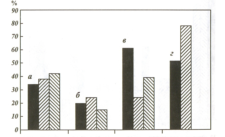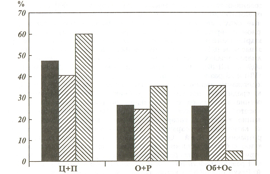 Figure 5. Preservation (integrity) of diamonds from the placers of the Anabar diamondiferous region [1]: Ц+П - whole and damaged, O+P - broken and chipped crystals, Oб+Oс - fragments and chips