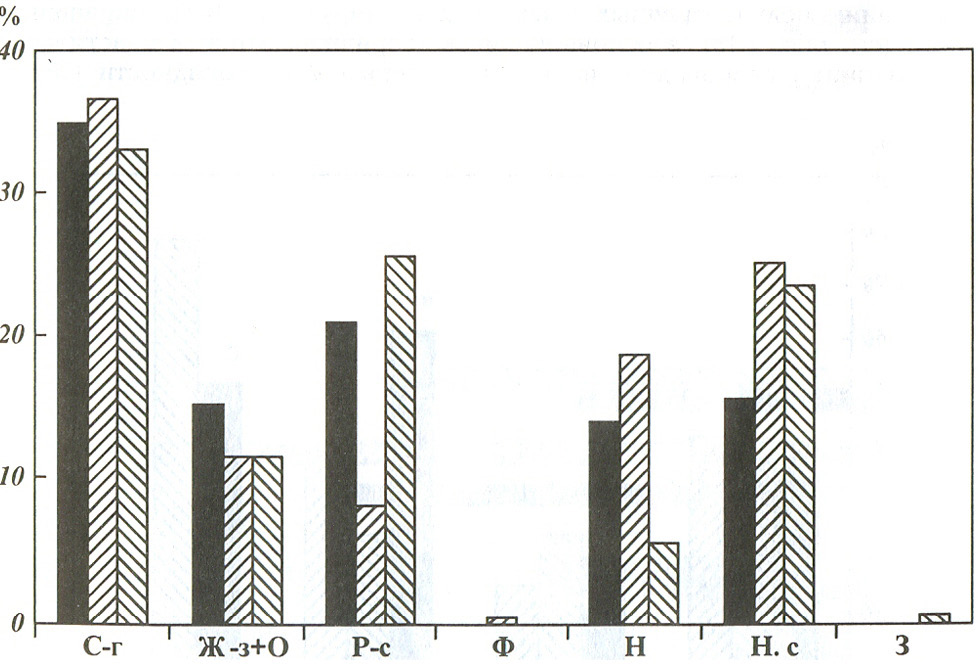 Figure 4. Photoluminescent features of diamonds from placers of the Anabar diamondiferous region [1]. Luminescence colours: C-г - medium-blue, Ж-з + O - yellow, green, orange, P-c - pink-lilac, Ф - violet, H – not determined, H.c - non-luminescent, 3 – zonally luminescent diamonds