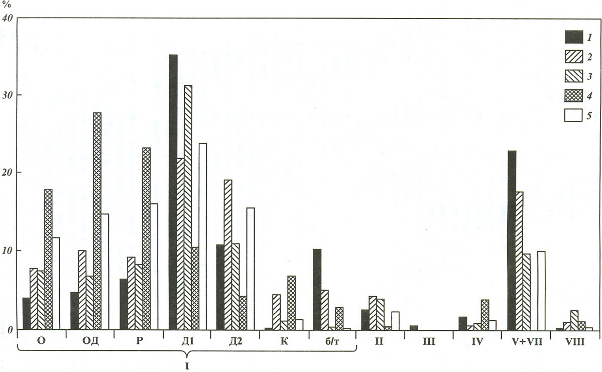 Figure 8. Typomorphic features of diamonds from placers of the Prilensky diamondiferous area [1]. I–IV, V+VII, VIII - diamond varieties according to Yu. L. Orlov (O - octahedrons, OД - transitional forms, Р - laminar rhombododecahedrons, Д1 - dodecahedrons with hidden layers, Д2 - dodecahedrons with shagreen, K - cubes, б/т – chips)