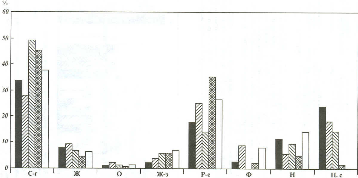 Figure 10. Photoluminescent features of diamonds from the placers of the Prilensky diamondiferous area [1]. Luminescence colours: С-г – medium-blue, Ж - yellow, O - orange, Ж-з - yellow-green, green, P-c - pink-lilac, Ф - violet, Н - not determined, Н.с - non-luminescent diamonds