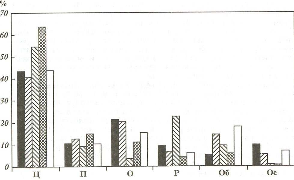 Figure 11. Preservation (integrity) of diamonds from the placers of the Prilensky diamondiferous area [1]. Ц - whole crystals, П - damaged, O - broken, Р - chipped, Oб - fragments, Oс - chips