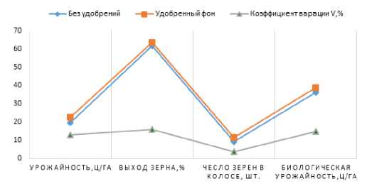 Выход зерна, высота растений, масса зерна с одного колоса показали, что, по сравнению с неудобренным вариантом, данные параметры имели незначительное повышение значений на 6,5; 6,2 и 4,0 % соответственно.