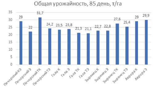 Рисунок 5. Общая урожайность сортов картофеля после обработки электромагнитным излучением (85-й день).