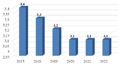 Использование новых технологических приемов позволяет снизить расход кормов на единицу продукции за счет повышения качества кормов. Динамика расхода всех кормов на производство 1 ц молока в центнерах кормовых единиц в 2015–2022 гг. в России наглядно показана на рис. 1.