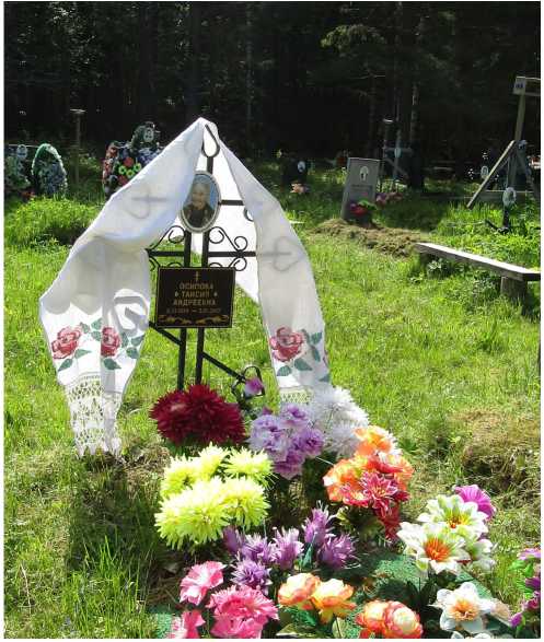 К локальной специфике относится зафиксированный в с. Прокопьевка обычай накрывать намогильное сооружение специальным полотенцем кодрасян чышкöд во время поминальной трапезы на кладбище: «Возьмут на кладбище его, сходят, потом постирают и обратно уберут. Потом из года в год и носят, когда идут на кладбище, кодрасян чышкöд и кодрасян пызандöра ‘поминальная скатерть’. Полотенце это на кладбище вешают на памятник во время поминок» [ПМА: А. И. Югова] (фото). Данная традиция, по-видимому, связана с воззрениями, согласно которым полотенце выступает в качестве границы, противопоставляющей мир живых миру предков, являясь в то же время связующим звеном между ними: «Здесь <на кладбище в с. Прокопьевка> похоронены мать, отец и сестра. Это полотенце специальное, поминальное, только поминать. У меня мать русская была, наполовину коми я. А здесь <с. Прокопьевка – Ю. Б.> так принято. Это полотенце мама вышивала, всем дочкам раздавала, и каждый приезжает поминать с таким полотенцем. Через это полотенце здороваешься с умершими и приглашаешь их обедать. А в Объячево такой традиции нет. Это только здесь полотенца приносят» [ПМА: Г. В. Осипова].